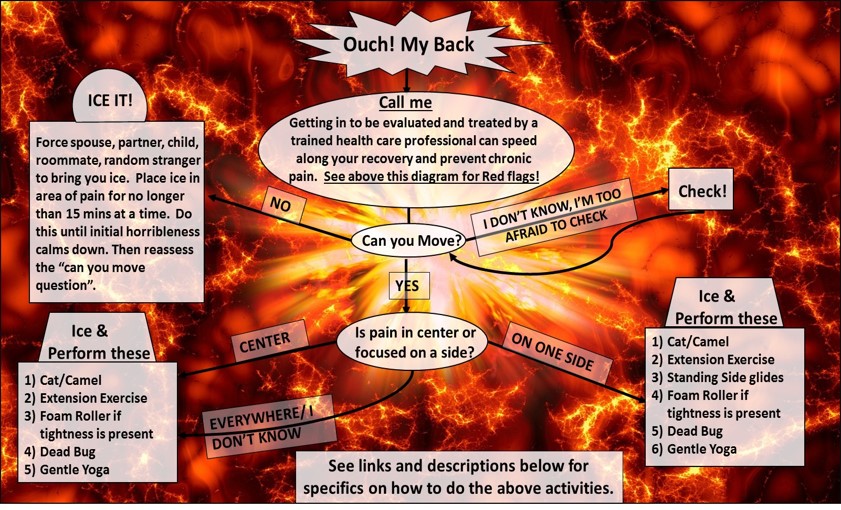 ATTENTION THESE ARE RED FLAGS, AKA GO GET HELP IMMEDIATELY. If you notice any changes in bowel/bladder function, erectile dysfunction, numbness or tingling in the area of your inner thighs, fever, progressive or severe numbness/weakness, or if the pain is so intense you can't even think of doing any of the below, go immediately to a health care provider, and if your preferred providers are not available, go to urgent care!